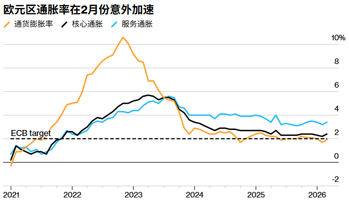 欧元区通胀意外加速,支持了欧洲央行对利率的谨慎态度,尤其是在伊朗战争导致能源价格飙升的情况下。欧元区2月份CPI同比上涨1.9%,高于1月份的1.7%,分析师预期1.7%。剔除波动较大的食品和能源价格后的核心CPI也意外地加速至2.4%,也高于预期和前值的2.2%。此外,欧盟统计局周二表示,备受关注的服务业通胀率升至3.4% 。